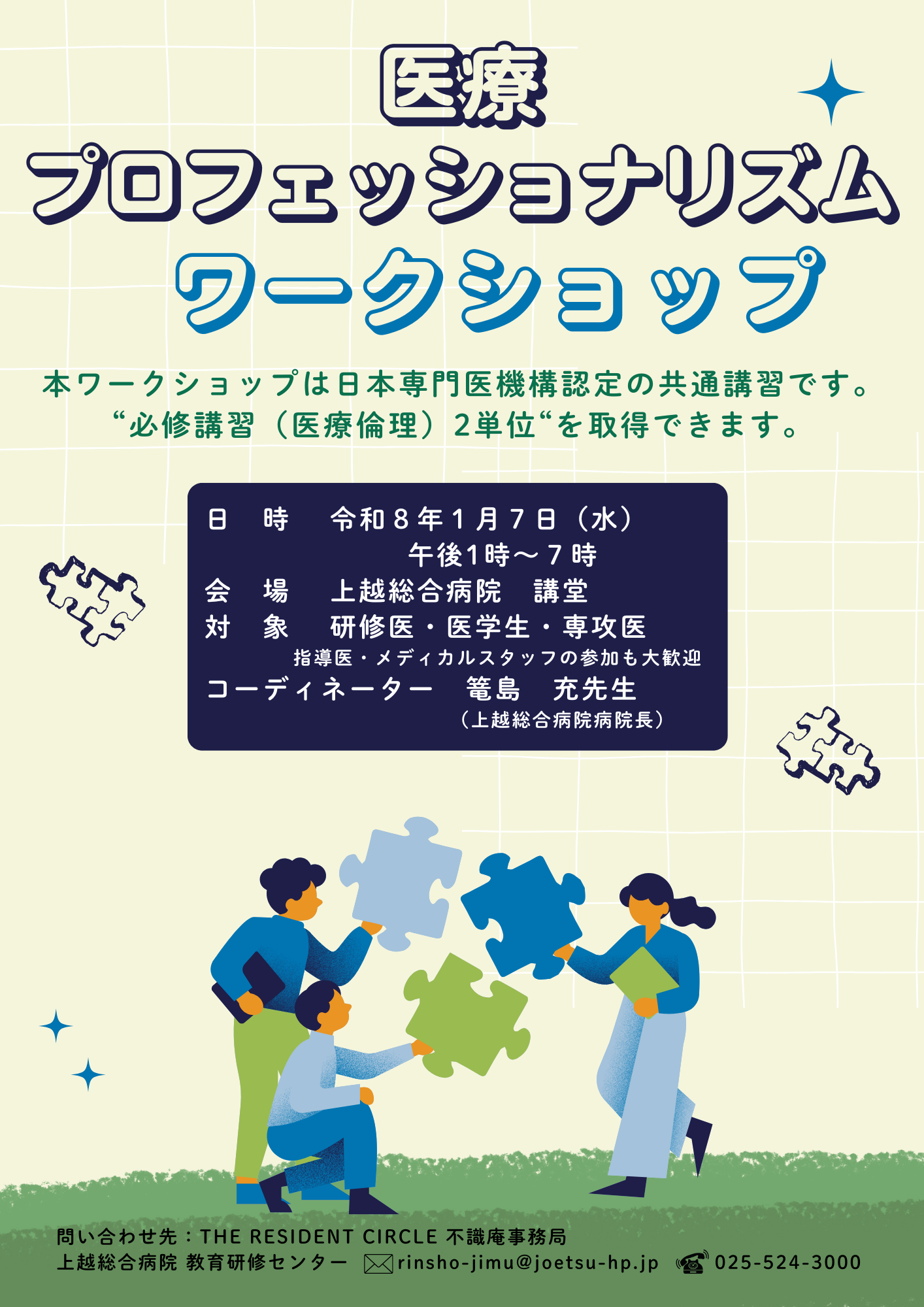 THE RESIDENT CIRCLE不識庵主催「医療プロフェッショナリズムワークショップ」開催のお知らせです。日 時:令和8年1月7日(水)午後1時~午後7時